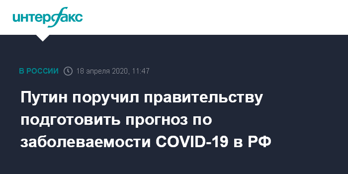 Москва. 18 апреля. INTERFAX.RU - Президент России Владимир Путин поручил правительству к 20 апреля обеспечить формирование краткосрочного прогноза количества граждан, которые могут заболеть коронавирусом.