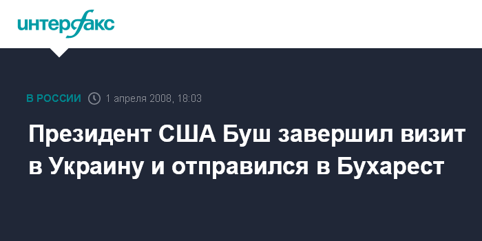 Киев. 1 апреля. INTERFAX.RU - Президент США Джордж Буш завершил государственный визит в Украину, сообщил агентству "Интерфакс" глава пресс-службы Министерства иностранных дел Василий Кирилич. В международном аэропорту "Борисполь" его провожали глава секретариата президента Виктор Балога, министр иностранных дел Владимир Огрызко, посол США в Украине Уильям Тэйлор и городской голова Киева Леонид Черновецкий.