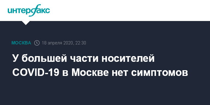 Москва. 18 апреля. INTERFAX.RU - В настоящее время в столице большая часть случаев заболевания коронавирусом выявляется у граждан, не имеющих симптомов, заявил глава департамента здравоохранения столицы Алексей Хрипун в эфире программы "Время" Первого канала в субботу.