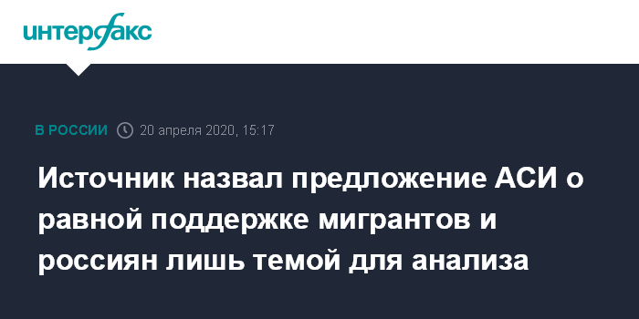 Москва. 20 апреля. INTERFAX.RU - Предложение Агентства стратегических инициатив (АСИ) оказать поддержку трудовым мигрантам, временно уравняв их права с правами граждан РФ, не является готовой к внедрению мерой, пока это только анализ международной практики, заявил "Интерфаксу" источник, близкий к наблюдательному совету АСИ.