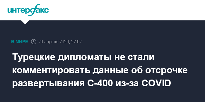 Москва. 20 апреля. INTERFAX.RU - В посольстве РФ в Турции не комментируют информацию о том, что Турция отложила развертывание систем С-400 из-за коронавируса.
