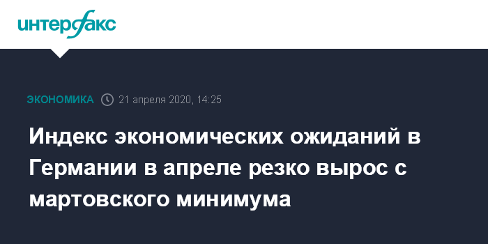 Москва. 21 апреля. INTERFAX.RU - Индекс экономических ожиданий инвесторов и аналитиков в Германии на ближайшие шесть месяцев, рассчитываемый исследовательским институтом ZEW, в апреле резко вырос с минимума за восемь лет, зафиксированного в марте.
