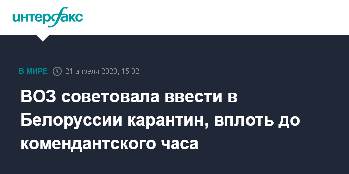 Москва. 21 апреля. INTERFAX.RU - Президент Белоруссии Александр Лукашенко сообщил, что Всемирная организация здравоохранения (ВОЗ) рекомендовала белорусским властям ввести карантин, вплоть до комендантского часа, чтобы предупредить распространение коронавирусной инфекции. При этом Лукашенко считает, что в ВОЗ "достаточно всегда политики".