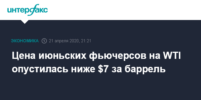 Москва. 21 апреля. INTERFAX.RU - Цена июньских фьючерсов на нефть WTI упала ниже отметки в $7 за баррель.