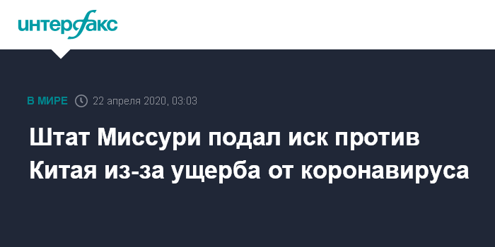 Москва. 22 апреля. INTERFAX.RU - Американский штат Миссури подал иск против Пекина в связи с его реакцией на COVID-19 и требует возместить ущерб, чтобы компенсировать "огромные человеческие потери, человеческие страдания и экономические потрясения", вызванные пандемией, сообщает The Hill.