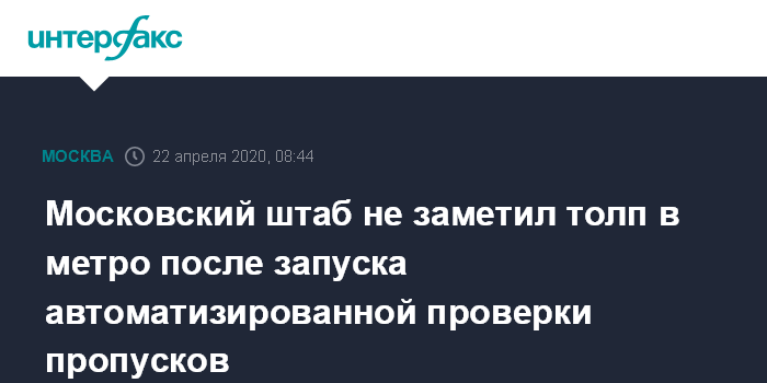 В связи с введением пропускного режима 15 апреля в московском метро на входах образовались очереди и даже толпы людей, поскольку пропуска проверяли полицейские и проверка была сплошной, а не выборочной. На въездах в город также образовались заторы, поскольку полиция установила там КПП, сузила проезд и начал проверять автомобилистов.