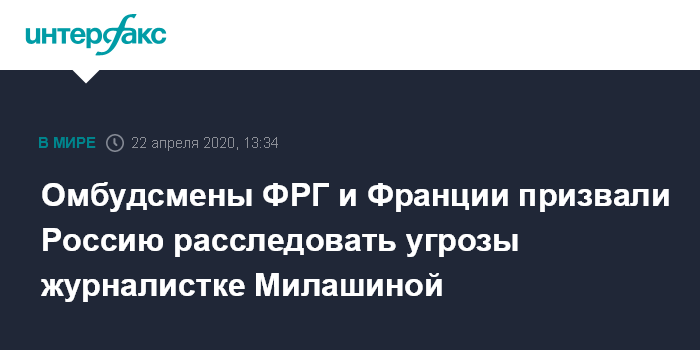 Омбудсмены ФРГ и Франции призвали Россию расследовать угрозы журналистке Милашиной