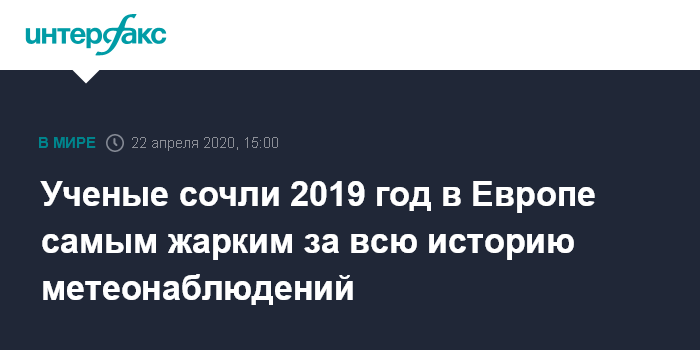 Москва. 22 апреля. INTERFAX.RU - 2019 год оказался наиболее жарким в Европе за все время наблюдения метеорологов, сообщают в среду западные СМИ со ссылкой на данные программы "Коперник" Службы по контролю за изменением климата ЕС (C3S).