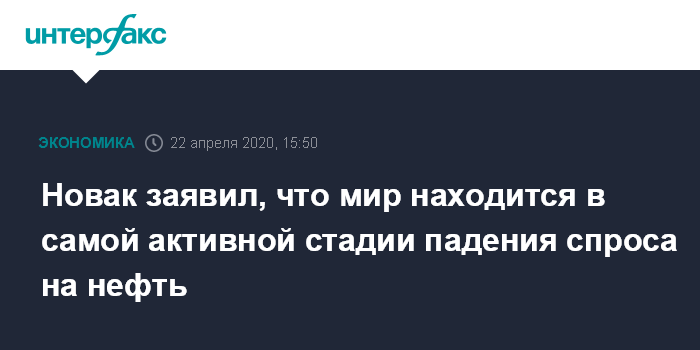 Москва. 22 апреля. INTERFAX.RU - Мир находится в самой активной стадии снижения спроса на нефть, по разным оценкам, спрос упал на 20-30 млн баррелей в сутки, сообщил министр энергетики РФ Александр Новак в ходе встречи с депутатами.