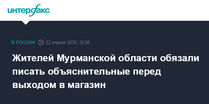 Москва. 22 апреля. INTERFAX.RU - В Мурманской области местные жители перед походом к врачу или даже в ближайший магазин должны написать объяснение и иметь его с собой, сообщает региональный оперативный штаб.