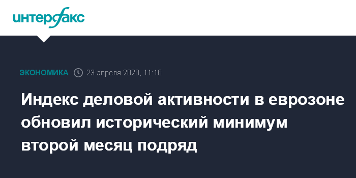 Москва. 23 апреля. INTERFAX.RU - Сводный индекс менеджеров закупок (PMI) 19 стран еврозоны в апреле 2020 года второй месяц подряд упал до рекордного минимума.