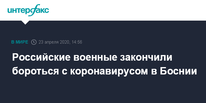 Москва. 23 апреля. INTERFAX.RU - Российские военные завершили выполнение задач по оказанию помощи Боснии и Герцеговине в борьбе с распространением коронавируса COVID-19, сообщает Минобороны России.