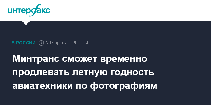 Москва. 23 апреля. INTERFAX.RU - Минтранс РФ на фоне пандемии COVID-19 сможет продлевать летную годность авиационной техники на основе документарной проверки, а также фото- и видеоматериалов. Соответствующее постановление правительства опубликовано на портале правовой информации.