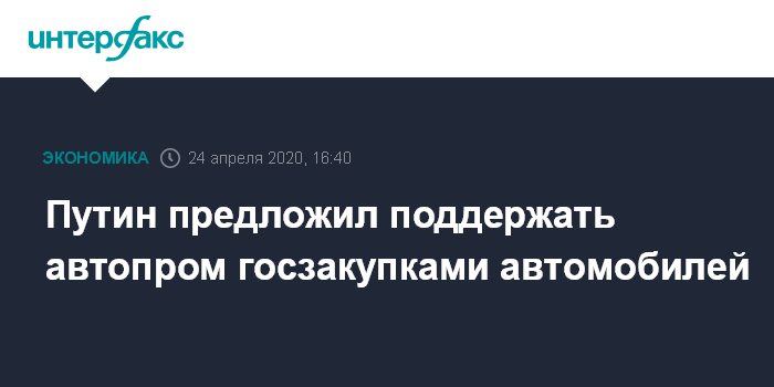 На заседании 24 апреля Путин также предложил поддержать спрос путем запуска продажи отечественных автомобилей со скидкой в 10%, подготовить перенос срока уплаты утилизационного сбора автоконцернами, поддержать автозаводы с локализацией производства в России, направить еще 6 млрд рублей на льготный автолизинг и 7 млрд рублей на программу льготного кредитования при покупке отечественных автомобилей.