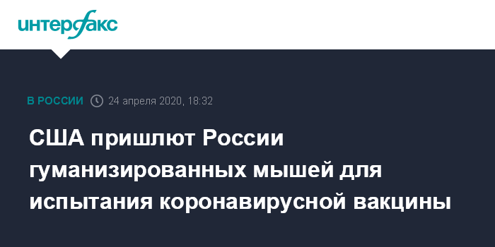 "Мы сейчас обменялись соответствующими письмами и ожидаем, что такие мыши приедут в Россию и мы будем иметь полноценную модель для доклинических испытаний (вакцины от коронавируса - ИФ)", - сказал Сергеев в интервью телеканалу "Россия-24" (ВГТРК) в пятницу.