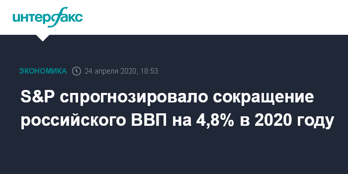 Москва. 24 апреля. INTERFAX.RU - Агентство Standard & Poor's ухудшило прогноз для российской экономики и теперь по базовому сценарию ожидает сокращения ВВП на 4,8% в 2020 году против прежнего прогноза о снижении на 0,8%.