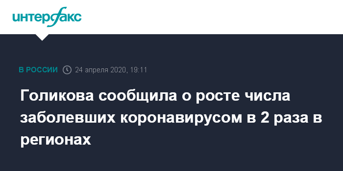 "Хоть это и закон малых чисел, но тем не менее, хочу сказать, что за эту же неделю рост заболеваемости в регионах страны, за исключением Москвы, и Московской области возрос выше, чем по России в целом - это уже в 2,3 раза", - сказал Голикова.