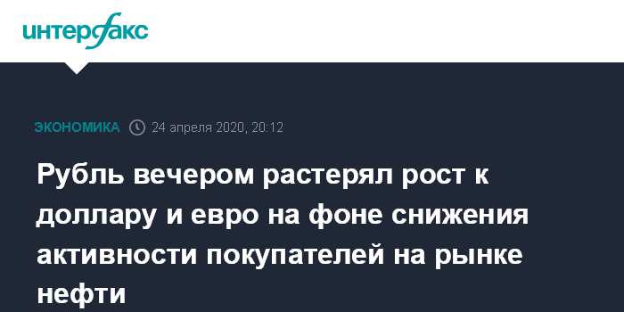 Как отмечают эксперты "Интерфакс-ЦЭА", рубль растерял рост к доллару и евро на вечерних торгах на фоне снижения активности покупателей на рынке нефти. К концу недели рубль сумел отыграть потери понедельника и вторника, и участники рынка постепенно сворачивают позиции перед майскими праздниками. Ранее рубль позитивно реагировал не только на рост цен на нефть, но и на решение ЦБ РФ перейти к стимулирующей политике.