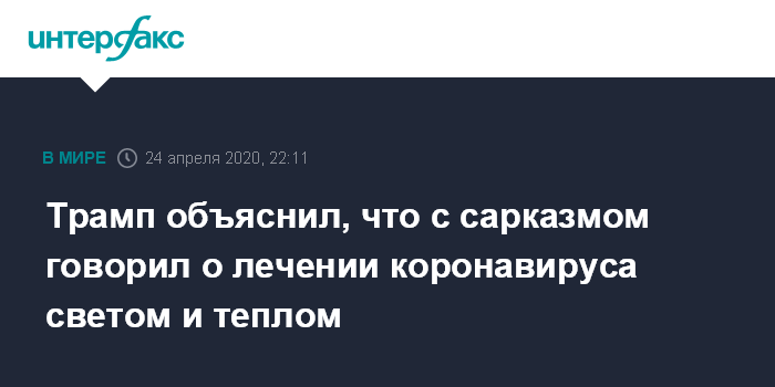Москва. 24 апреля. INTERFAX.RU - Президент США Дональд Трамп объяснил, что днем ранее он с сарказмом предложил рассмотреть свет, тепло и дезинфицирующие средства как способ потенциального лечения нового типа коронавируса, пишет в пятницу The Hill.