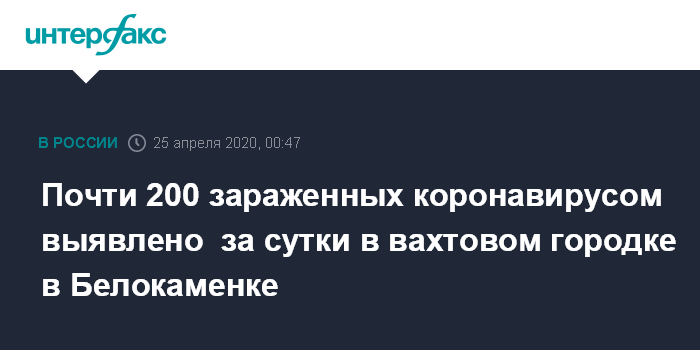 Москва. 25 апреля. INTERFAX.RU - В вахтовом городке подрядчика Центра строительства крупнотоннажных морских сооружений (ЦСКМС) ООО "НОВАТЭК-Мурманск" в селе Белокаменка (с.п.Междуречье, Кольский район, Мурманская область) за сутки выявлено еще 192 больных коронавирусом, сообщил в субботу оперативный штаб Мурманской области.