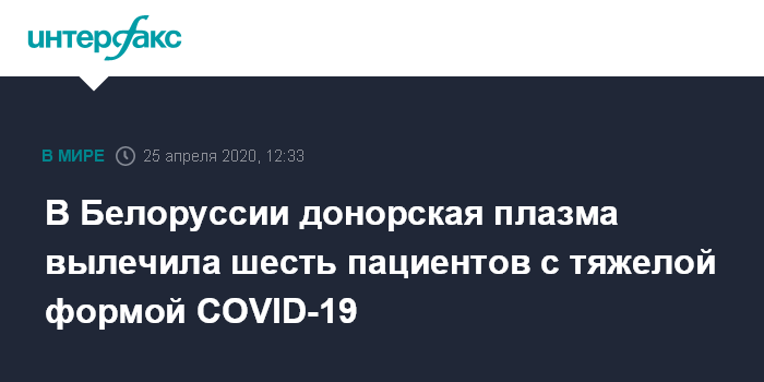 Москва. 25 апреля. INTERFAX.RU - Правительство Белоруссии сообщило о шести случаях успешного излечения тяжелой формы коронавируса при переливании им донорской плазмы от перенесших COVID-19.