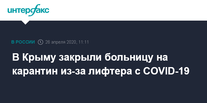 Москва. 26 апреля. INTERFAX.RU - Больница в Красногвардейском районе Крыма переведена в режим обсерватора из-за заражения новым коронавирусом лифтера, сообщила руководитель регионального управления Роспотребнадзора Наталья Пеньковская.