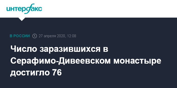 Москва. 27 апреля. INTERFAX.RU - В Свято-Троицком Серафимо-Дивеевском монастыре подтверждено уже 76 случаев заражения коронавирусом, сообщило правительство Нижегородской области. Днем ранее говорилось о 56 случаях в селе Дивееве, которое закрыли на карантин. К понедельнику в Дивееве было подтверждено 77 случаев заражения.