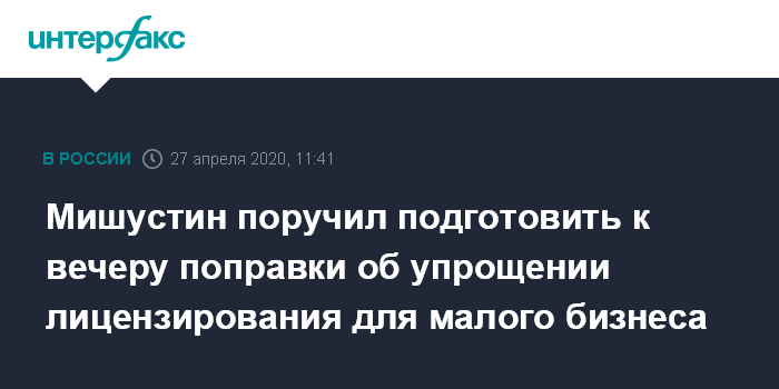 Москва. 27 апреля. INTERFAX.RU - Премьер-министр Михаил Мишустин поручил правительству до конца рабочего дня 27 апреля подготовить законопроект, облегчающий лицензирование для малого и среднего бизнеса. Также он предложил увеличить с 60 до 180 дней сроки погашения административных штрафов для таких предприятий.