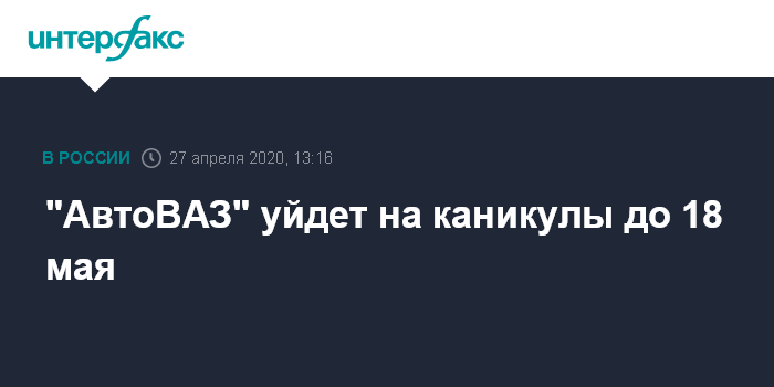 Москва. 27 апреля. INTERFAX.RU -"АвтоВАЗ" остановит производство автомобилей с 29 апреля до 18 мая 2020 года, сообщил председатель первичной профсоюзной организации предприятия Сергей Зайцев.
