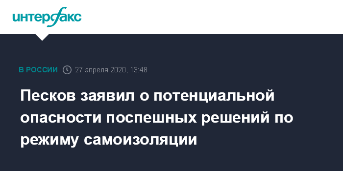 Москва. 27 апреля. INTERFAX.RU - России удалось избежать скачкообразного роста заболеваемости коронавирусом, в этой ситуации нельзя допустить поспешных решений, заявил пресс-секретарь президента РФ Дмитрий Песков.