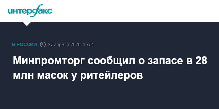 Москва. 27 апреля. INTERFAX.RU - Российские крупнейшие торговые сети уже запасли более чем 28 млн масок разных типов на продажу, в апреле их закупки превзошли мартовские в полтора-два два раза, сообщили в пресс-службе Минпромторга.