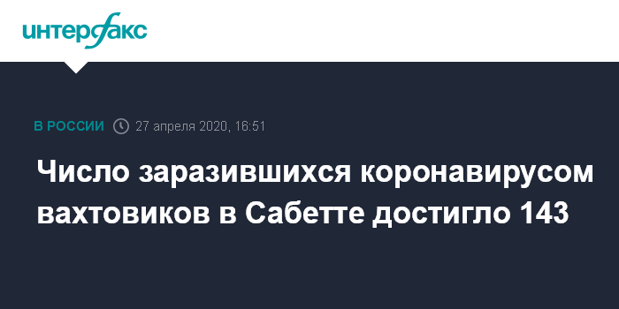 Москва. 27 апреля. INTERFAX.RU - У вахтовиков в поселке Сабетта на Ямале подтверждено 143 случая коронавирусной инфекции, сообщает оперативный штаб Ямало-Ненецкого автономного округа.