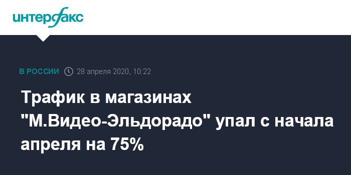 Москва. 28 апреля. INTERFAX.RU - С начала апреля в магазинах бытовой техники и электроники сети "М.Видео-Эльдорадо" трафик упал на 75% в годовом измерении после введения карантинных ограничений.