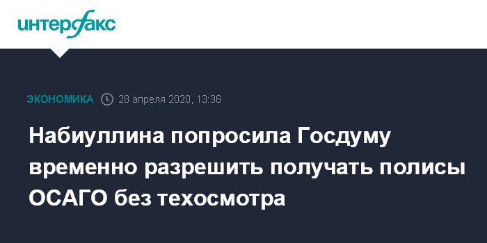 Москва. 28 апреля. INTERFAX.RU - Председатель Банка России Эльвира Набиуллина попросила депутатов Госдумы принять временный закон о возможности выдавать полис ОСАГО автомобилисту, не прошедшему техосмотр, при условии, что он представит диагностическую карту после снятия карантинных ограничений.