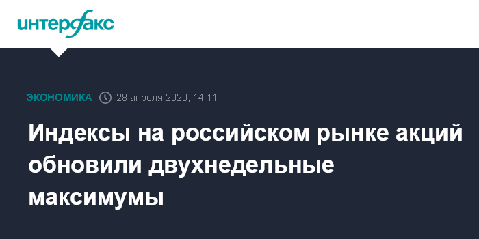 Москва. 28 апреля. INTERFAX.RU - Рынок акций РФ днем во вторник ускорил подъем вслед за мировыми фондовыми площадками на ожиданиях постепенного смягчения карантинных ограничений по всему миру из-за COVID-19, росту также способствовал отскок в нефтяных фьючерсах после падения; индексы МосБиржи и РТС преодолели рубежи 2600 и 1100 пунктов и достигли уровней двухнедельной давности.