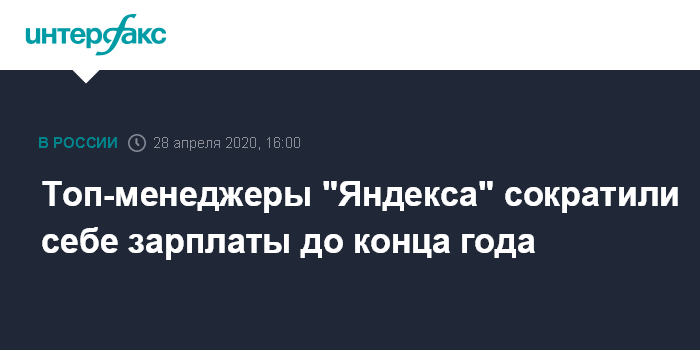 Москва. 28 апреля. INTERFAX.RU - Топ-менеджеры "Яндекса" решили сократить себе зарплаты до конца 2020 года, сообщил в ходе телеконференции операционный и финансовый директор группы Грег Абовский. Они также отказались от бонусов. Насколько сократятся зарплаты, он не уточнил.