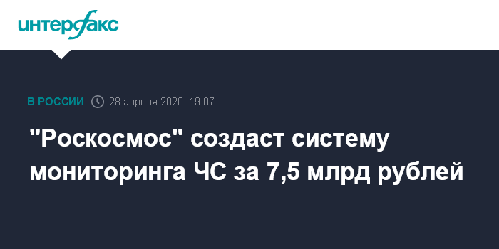 Москва. 28 апреля. INTERFAX.RU - "Роскосмос" выделил 7,5 млрд рублей на создание космической системы мониторинга чрезвычайных ситуаций, следует из материалов портала госзакупок.
