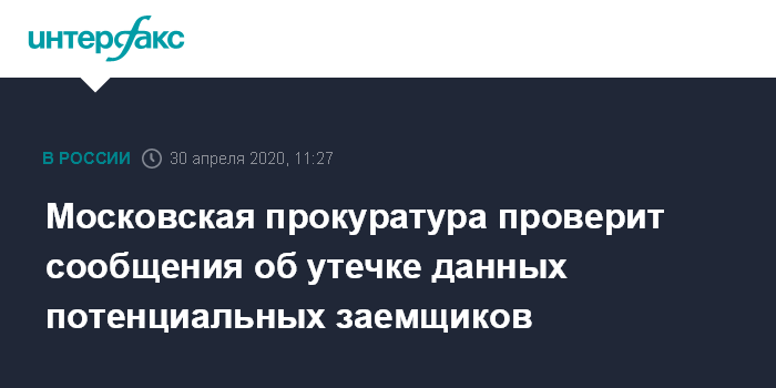 Москва. 30 апреля. INTERFAX.RU - Генпрокуратура России поручила прокуратуре Москвы провести проверку материлов СМИ о предполагаемой утечке данных россиян, желающих получить кредиты.