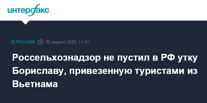 Москва. 30 апреля. INTERFAX.RU - Госинспектор Россельхознадзора не выпустил из новосибирского аэропорта утку, привезенную туристами, прибывшими 27 апреля из Камрани (Вьетнам) на вывозном рейсе.