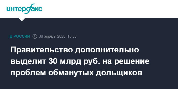 Москва. 30 апреля. INTERFAX.RU - Правительство выделит 30 млрд рублей на решение проблемы обманутых дольщиков, еще 12 млрд рублей пойдут банкам на компенсацию недополученных доходов от снижения ставки по кредитам для застройщиков до размера ключевой, сообщил премьер РФ Михаил Мишустин.