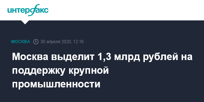Москва. 30 апреля. INTERFAX.RU - Мэрия Москвы выделила 1,3 млрд рублей на субсидии крупным промышленным предприятиям субсидии на сумму 1,3 млрд рублей, сообщил оперативный штаб по экономическим вопросам.