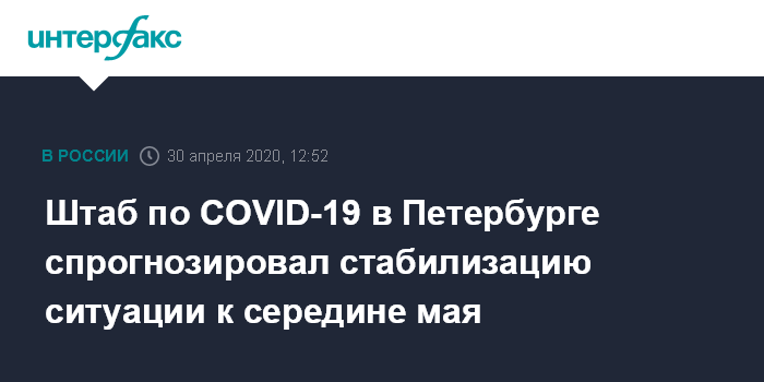 Москва. 30 апреля. INTERFAX.RU - В межведомственной рабочей группе по противодействию распространению коронавируса в Петербурге рассчитывают, что ситуация стабилизируется к середине мая.