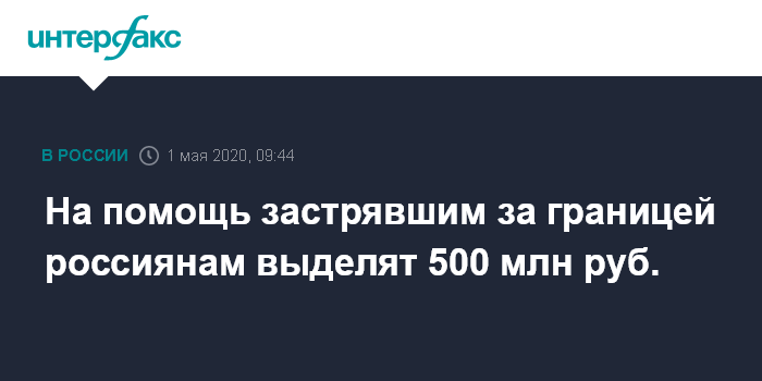 Москва. 1 мая. INTERFAX.RU - Правительство РФ выделило 500 млн руб. на оказание социальной поддержки российским гражданам, находящимся за границей и временно не имеющим возможности вернуться на родину из-за пандемии COVID-19.