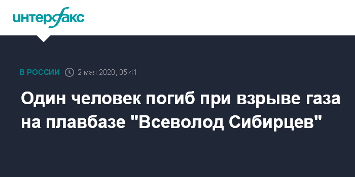 Москва. 2 мая. INTERFAX.RU - Один человек погиб, еще один пострадал при взрыве газового баллона на крупнейшем в РФ плавзаводе "Всеволод Сибирцев" в приморской Находке, сообщил агентству "Интерфакс" представитель компании-судовладельца.