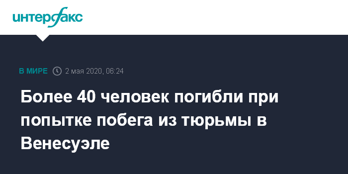 Москва. 2 мая. INTERFAX.RU - На северо-западе Венесуэлы заключенные напали на сотрудников тюрьмы в городе Гуанаре и попытались совершить побег, в результате погиб 41 человек, более 50 получили ранения, сообщает El Nacional со ссылкой на данные полиции.