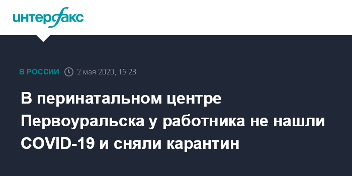 Москва. 2 мая. INTERFAX.RU - Роспотребнадзор по Свердловской области снял карантин, введенный в перинатальном центре Первоуральска, у сотрудника которого при дополнительном обследовании коронавирус не подтвердился, сообщили "Интерфаксу" в оперативном штабе региона.