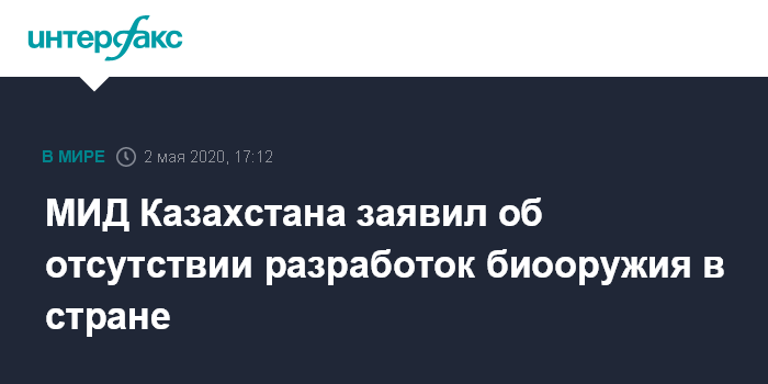 Москва. 2 мая. INTERFAX.RU - В Казахстане не ведется никаких разработок биологического оружия, заявили в субботу в МИД республики.