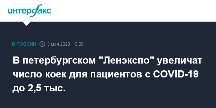Москва. 3 мая. INTERFAX.RU - Власти Санкт-Петербурга планируют увеличить до 2,5 тысяч количество коек на площадке выставочного комплекса "Ленэкспо" для приема больных с легким течение COVID-19, сообщает пресс-служба администрации губернатора в воскресенье.