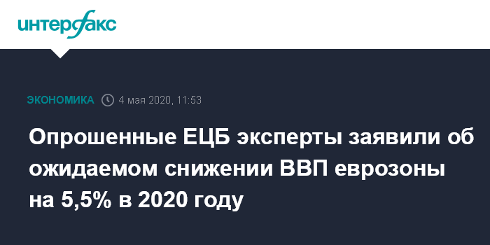 Москва. 4 мая. INTERFAX.RU - Опрос аналитиков, проведенный Европейским центральным банком (ЕЦБ), указал на резкое ухудшение их ожиданий для ВВП еврозоны, а также инфляции и безработицы на 2020 год, вызванное негативными последствиями пандемии коронавирусной инфекции COVID-19 и ограничительных мер, введенных с целью сдерживания ее распространения.