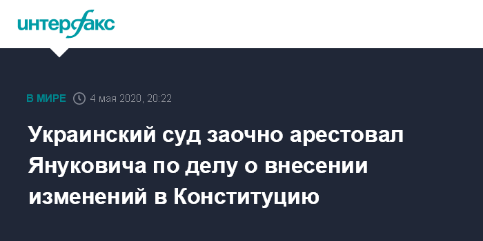 Москва. 4 мая. INTERFAX.RU - Печерский районный суд города Киева в понедельник избрал экс-президенту Украины Виктору Януковичу меру пресечения в виде заочного ареста по делу о внесении изменений в Конституцию с целью захвата власти (ч.2 ст.27, ч.1 ст.109 УК Украины).